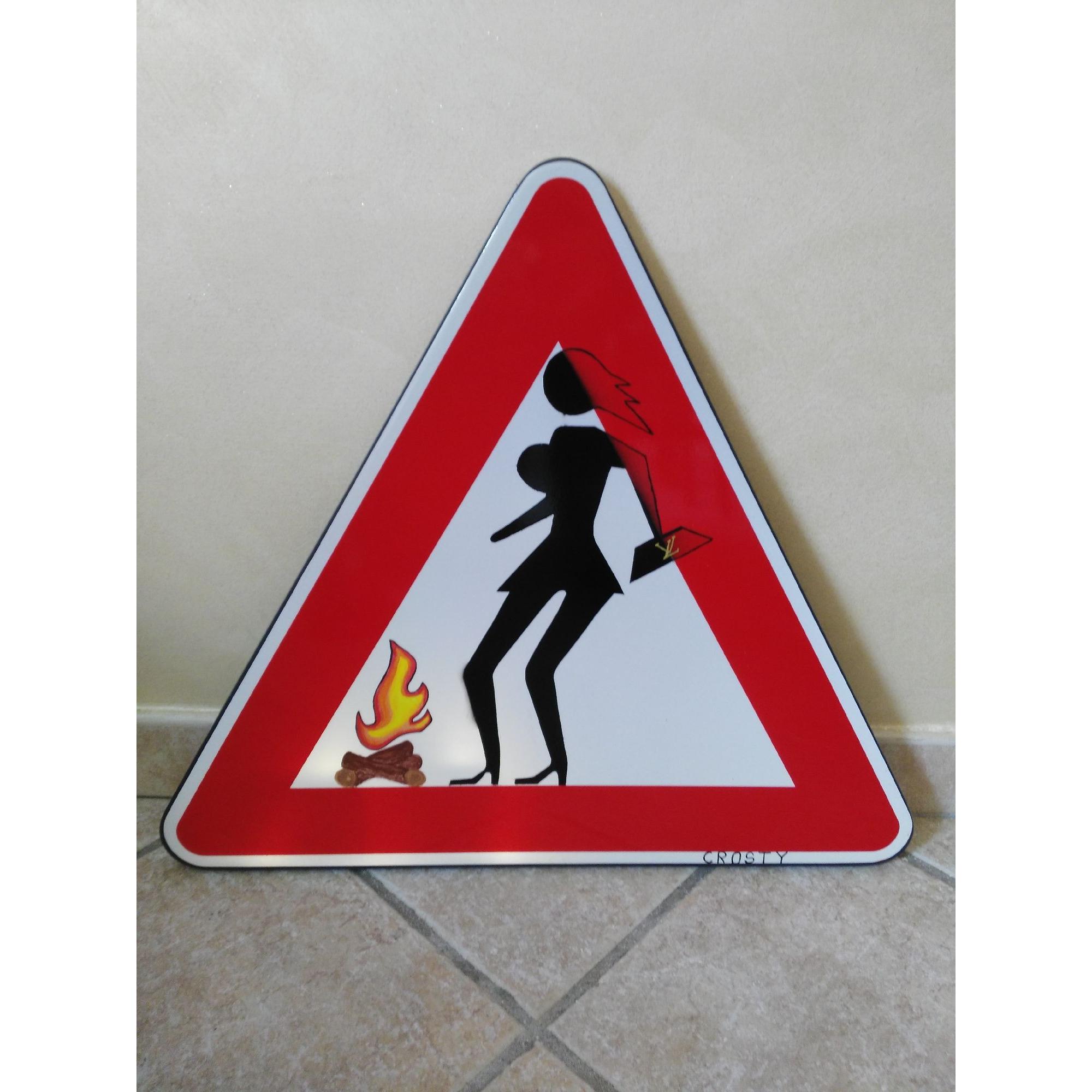 Vernice spray a Stencil , e acrilico su cartello stradale, titolo: "pericolo fiamme libere" sul cartello oltre un fuoco è impressa la figura di una prostituta che sembra entrare nel cartello di pericolo , con l'opera si vuole porre l'attenzione sulla problematica prostituzione e sfruttamento alla prostituzione che troppo spesso la società di oggi fa finta di non vedere.